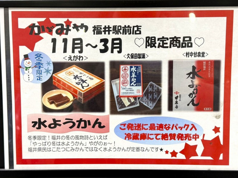 福井の厳しい寒さが寒天を固めるのに適していたこと、かさ増しした糖度の低い水ようかんは夏場の保存が難しかったことから、福井独自の「冬に食べる水羊羹」という文化が広まっていったと考えられています。