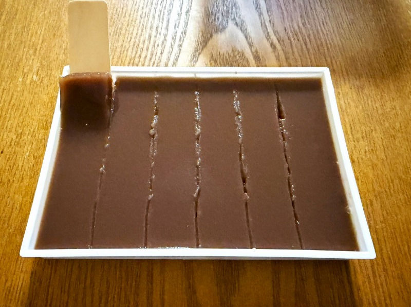つまり、水羊かんが、空気(酸素)と極力接触しないように、①真空パックのシート、②脱酸素剤(エージレス)の封入、③水羊かんの上に敷かれた透明シート、と三重に守られていることがわかりました。まさに、鉄壁の防御態勢!これが賞味期限2週間を可能にしたのでしょうか?