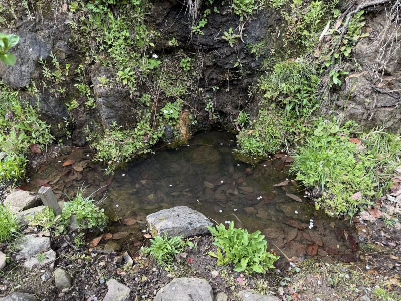 午後の最初の調査は、民家の裏庭にある小さな池です。裏山の岩の裂け目を伝って、水が染み出ている場所です。